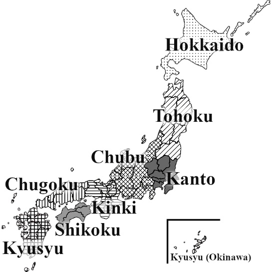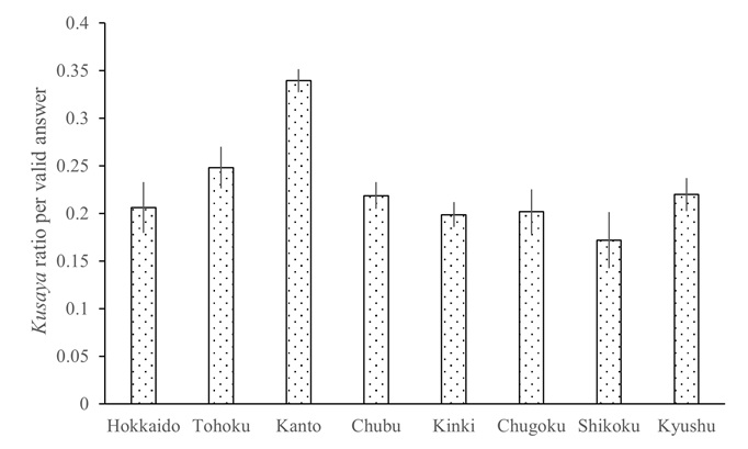 Figure 1. a: Kusaya response rate by region. The height of the bar indicates the ratio of kusaya responses per valid responses in each of the eight regions in the smelly food questionnaire. The straight line at the top of the bar represents the standard error. b: A map of Japan divided into eight regions to aid geographical understanding of each region.