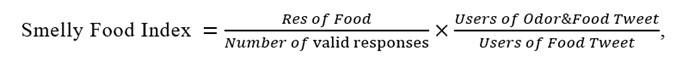 To test Hypotheses I and II, we developed the Smelly Food Index for this study to select smelly foods. The Smelly Food Index was calculated by multiplying the ratio of responses to a descriptive questionnaire for each smelly food with the strength of the relationship between “smelly” and the smelly food’s name in the corpus, including synonyms. We used a Smelly Food Index because a selection based on the descriptive questionnaire alone might include foods that are easy to recall but not particularly smelly. As the number of descriptive questionnaires affects the accuracy of the hypothesis testing, the selection was limited to the top 10 foods in the responses. Specifically, 10 foods with the highest number of responses were selected from the names of foods described as smelly in the questionnaire, and the ratio of each food name in the valid responses was calculated as the food recall index. Next, the relationship index between odor terms and food names was calculated for the 10 foods using Twitter data in Japan from 2016 to 2020 as a corpus (the method is described in Section 2.4.2). Finally, to calculate the Smelly Food Index, we multiplied the food recall index for each food name by the relationship index determined by Twitter data. The formula is as follows: