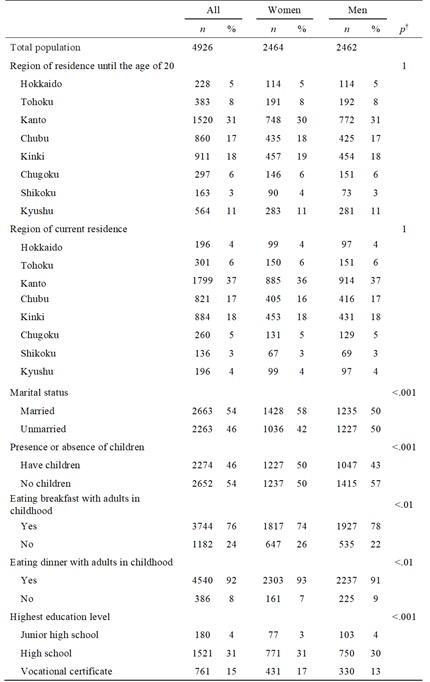Additionally, participants were asked to indicate the province in which they had lived the longest before the age of 20, whether they ate breakfast and/or dinner with adults during their childhood, their highest level of schooling, and whether they had consumed alcohol or smoked in the past year.