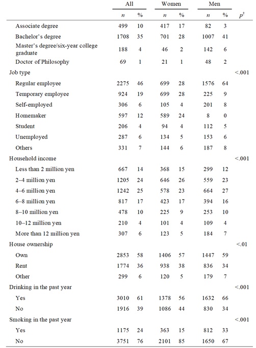 This study was approved by the Ethics Review Committee for Life Science Research in BIPROGY Inc. (ID: 2020-002, approved with conditions on March 24, 2020; conditions were removed on May 21, 2020). The survey was conducted via a website from August 6 to September 8, 2021, targeting people living in Japan. The number of recruits was stratified using Basic Resident Registration population data (Ministry of Internal Affairs and Communications, Japan, 2021) to approximate age (20–59 years, in 5-year increments), gender, and prefecture of residence of the participant group to be recruited to the Japanese population distribution.