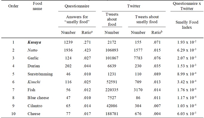 We used a Smelly Food Index, a combination of a descriptive questionnaire and natural language processing of tweet data on Twitter, to select representative smelly foods found in Japan. Natural language processing of the tweet data was used to correct the results of the descriptive questionnaire, which may be sensitive to recall, using the association between odor and food in the text. Due to individual differences in olfaction and odor preferences, it was difficult to measure “smelly” accurately. Therefore, it was difficult to validate the Smelly Food Index. However, the superiority of the Smelly Food Index over the descriptive questionnaire may be proven in the future when both results are compared between a human population and experts.