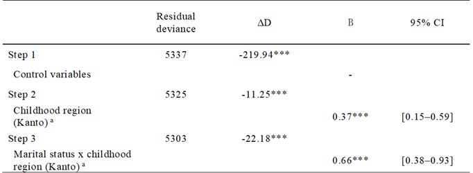 We examined the moderating effect of living in the Kanto region until the age of 20 on the association between marital status and recall of kusaya as a smelly food using the interaction term entered into a hierarchical multiple regression analysis. We tested the model in Step 3 by adding an interaction term between childhood region (Kanto) and marital status to the model in Step 2, comprising control variables and childhood region (Kanto) until the age of 20 (Table 3). As a result, the degree of deviance in Step 3 in the model was significantly improved (ΔD = -22.18, p < .001) from Step 2, and the coefficient of the interaction was also statistically significant (B = 0.66, z = 4.70, p < .001) (Table 3). Therefore, multiple comparisons were performed using the interaction term between childhood region (Kanto) and marital status in the Step 3 model (Table 3).
