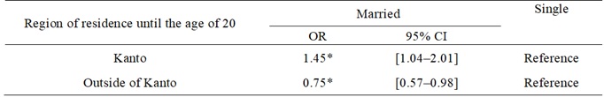Table 4. Moderating effects, by marital status, of living in the Kanto region up to age 20 on changes in the probability of naming kusaya when asked to name a smelly food.