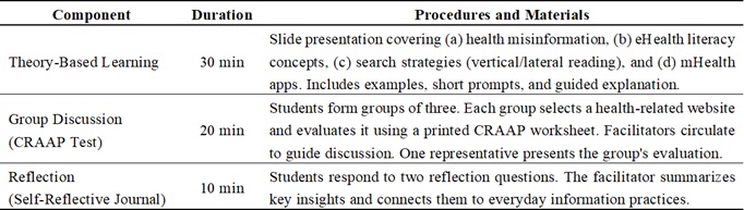 The eHealth literacy workshop was conducted in a single session, facilitated by three researchers involved in this study. Its primary aim was to provide Japanese undergraduate students with foundational knowledge and practical learning experiences to foster eHealth literacy, thereby enabling them to search for, analyze, and apply online health information in their daily lives. The overview of the eHealth literacy workshop procedure is listed in Table 2. To enhance replicability and transparency, detailed procedures and instructional materials for each component are described below.