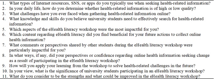 The lead author conducted semi-structured interviews (Merriam, 1998) with each participant, using an interview guide based on principles of transformative learning theory. Before conducting the interviews, the lead author explained the semi-structured interview process to each participant. All participants agreed to take part in individual, in-person interviews (one researcher and one participant), which were scheduled on dates they selected in advance. The guide included 11 core questions (Table 3) designed to explore undergraduate students’ learning experiences during the eHealth literacy workshop. In addition to these structured questions, the researcher posed supplementary unstructured follow-up questions tailored to participants’ responses. All questions were developed to gain deeper insights into instructional methods and content that influenced students’ learning outcomes. Each interview lasted about 60 minutes.
